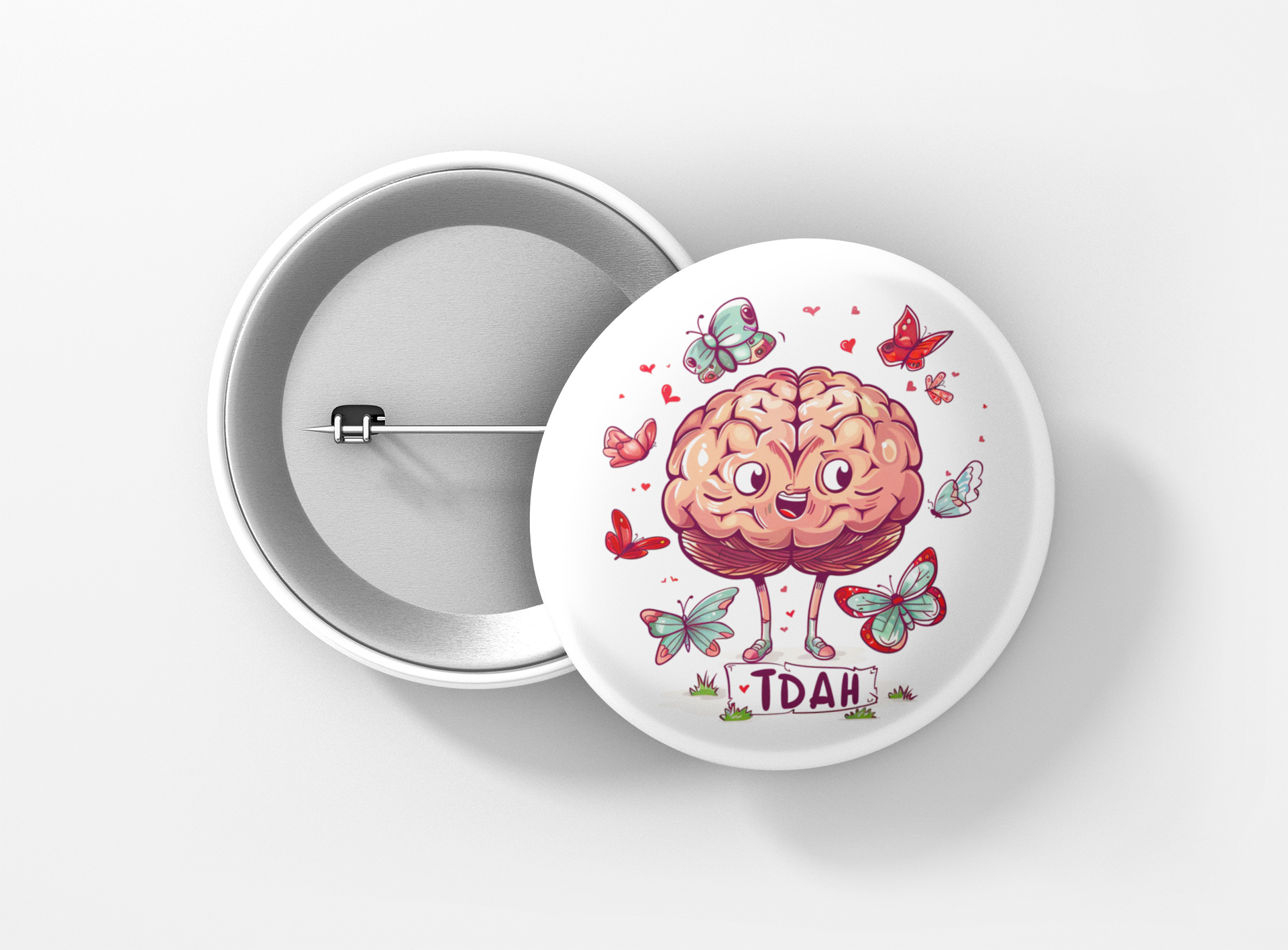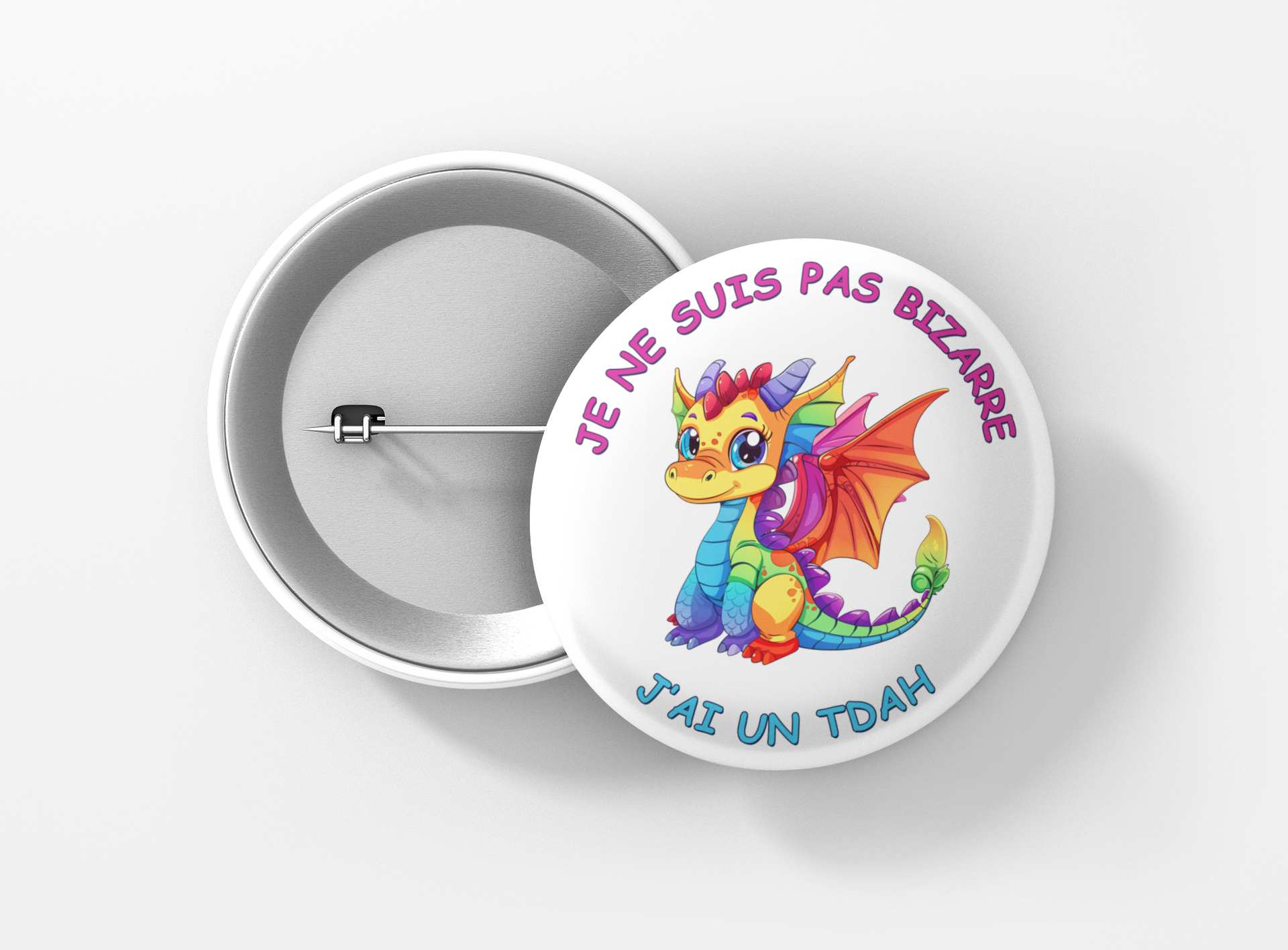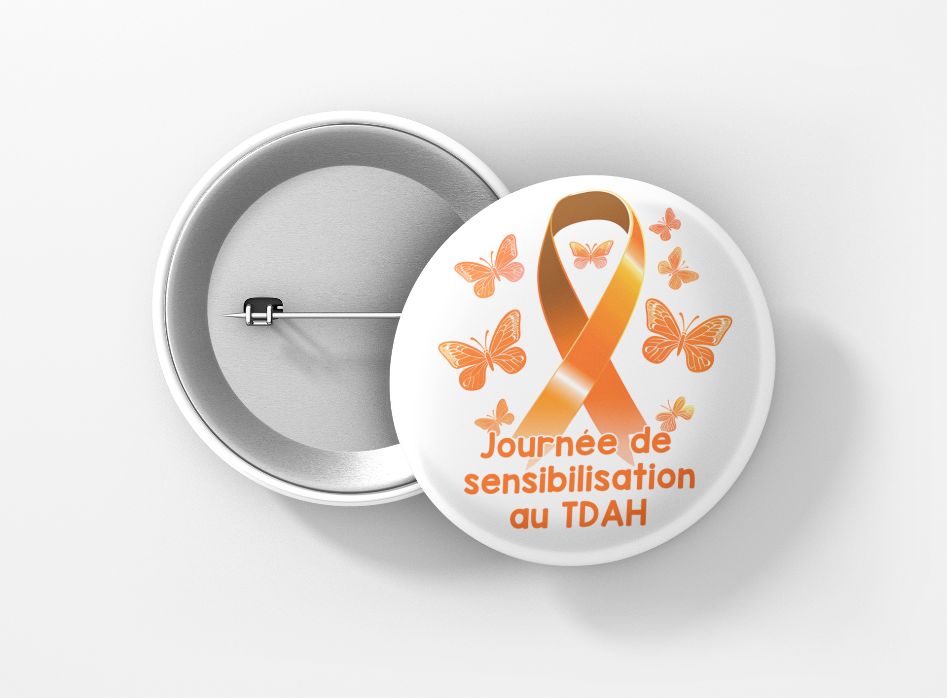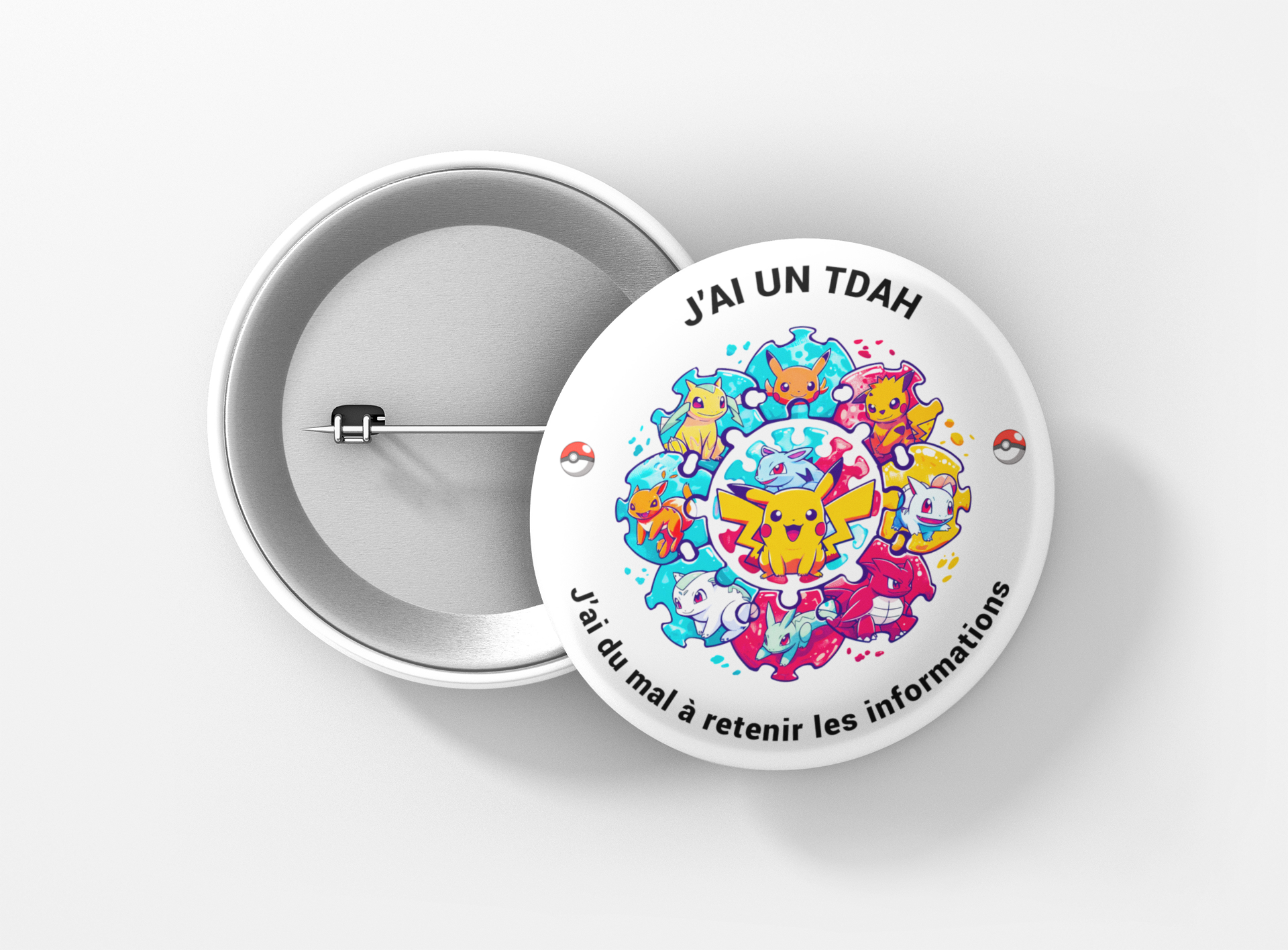 Un badge conçu pour sensibiliser au Trouble du Déficit de l'Attention avec ou sans Hyperactivité (TDAH) et favoriser la compréhension des défis liés à la mémoire et à la concentration.
